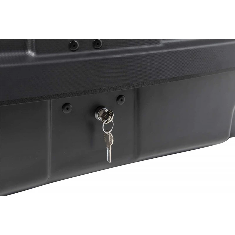 Blocco antifurto: cinghie di sicurezza posteriori e anteriori. Sistema di ancoraggio con morsetti da fissare al telaio del portabiciclette. Maniglia antifurto inclusa. Sistema brevettato di bloccaggio a doppio clic che consente di rimuovere la chiave solo se il coperchio è completamente chiuso in modo sicuro.